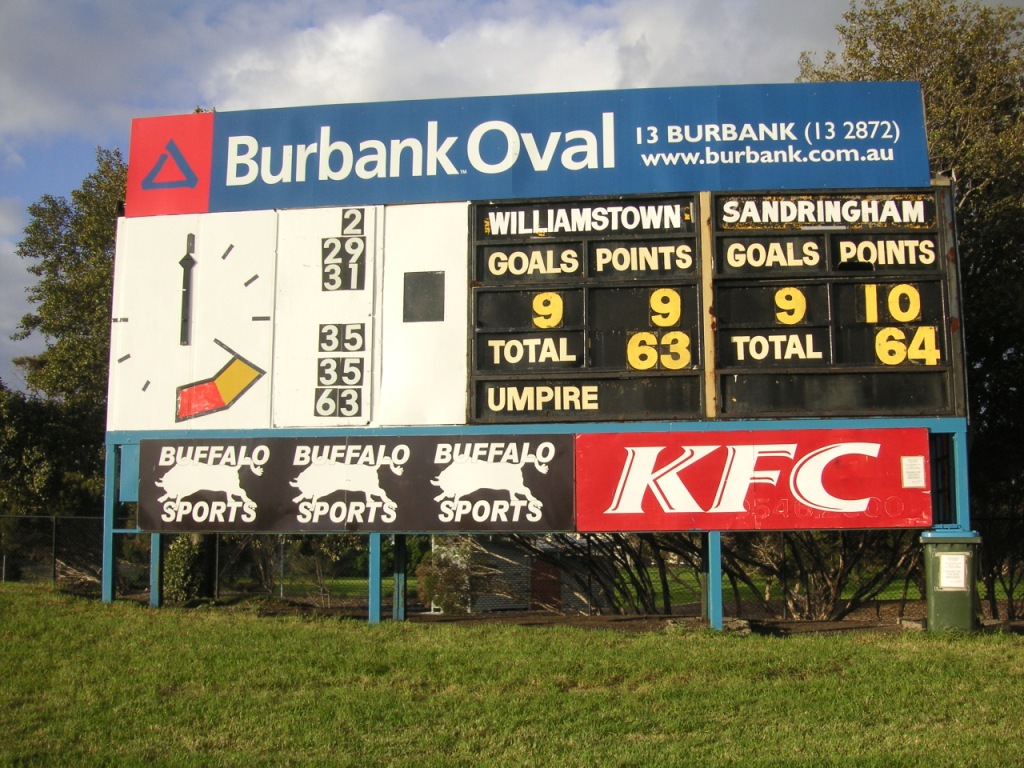 Williamstown’s last home game in 2010 against Frankston was its last home game for some time. The ground and the grandstand are undergoing $8million of redevelopment. The 1975 scoreboard might get a makeover too, come 2012 when the Seagulls return to their nest.