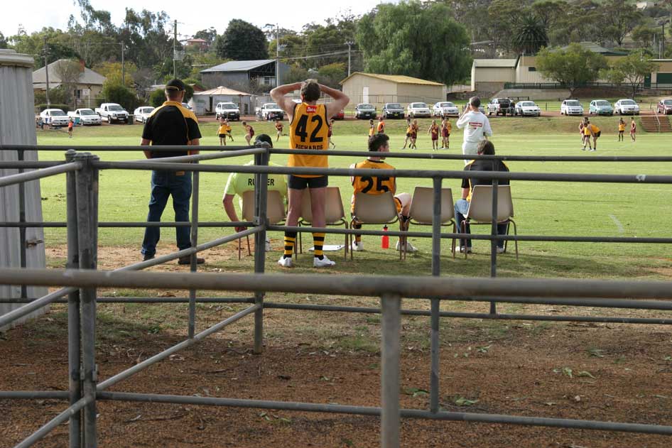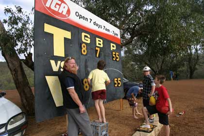Patience is the key for scoreboard attendants according to Blue, the man in charge at Toodyay. Blue is helped by a team of enthusiastic youngsters who listen carefully to his instructions and get the scores up quickly. He’s not the kind to get too worried about making mistakes: “The goal umpires keep you in line,” he said.