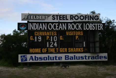 The oval at Cervantes had the day-after look when we visited on Sunday 2 July 2011. The day before the Tiger Sharks had thrashed Lancelin to cap off the celebrations of the 10th anniversary of a league premiership and the 20th anniversary of a little league flag in the Central Midlands Coastal Football League.