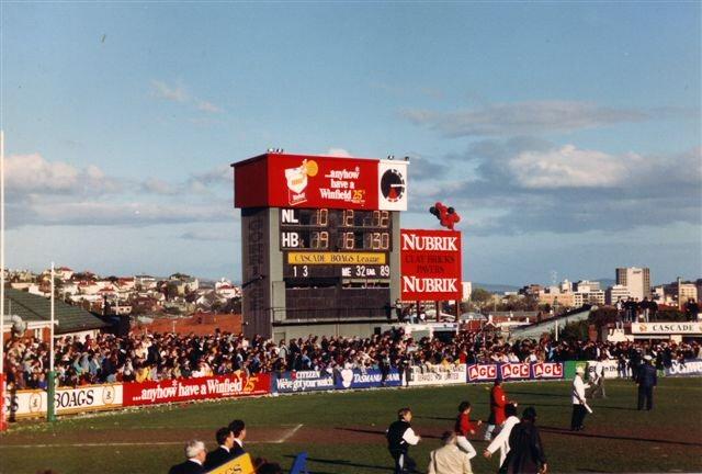 The current North Hobart scoreboard was built in 1972 and was operating for the TANFL Grand Final that year. It was known as the Gorringe Electronic Scoreboard in its early years as it was sponsored by the Donald Gorringe truck motor company in North Hobart.