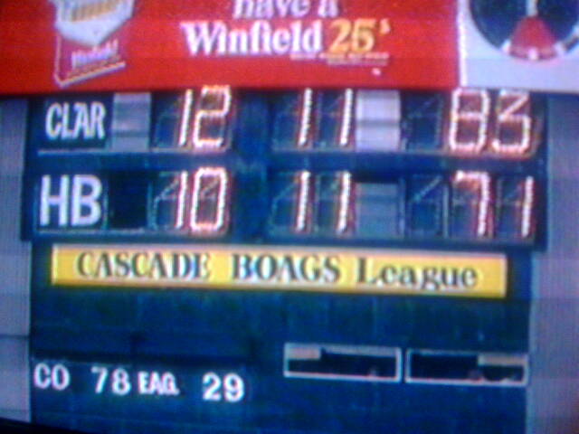 Three-quarter time in the 1990 TFL Preliminary Final between Clarence and Hobart. Matt Cramond notes: “Hobart went on to win the game and Collingwood can be seen serving it up to West Coast in the score updates.”