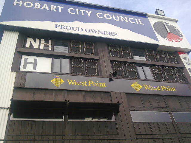 After much trial and error with new systems, the Hobart City Council replaced the main electronic section with a new, but smaller face in 2011 at a cost of $46,000. It is fitted with red electronic numbers and electronic team names and operated via computer from the Doug Plaister Stand.