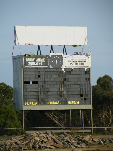 […] know if anyone souvenired parts of the scoreboard. (A St Kilda fan, for example, has parts of the old Moorabin scoreboard in his […]