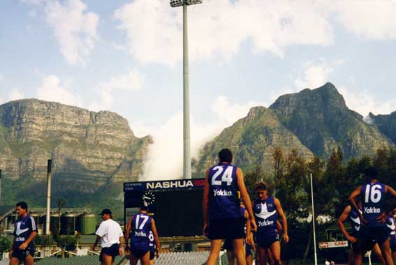 The photo gives a clear indication of the height of giant ruckman Matthew Burton (24) in comparison to the fabled Table Mountain. Also in the photo are Andrew McGovern (far left), sprints coach Glen Ewen, Brodie Holland (17), James Walker (facing Burton) and Clem Michael (16).
