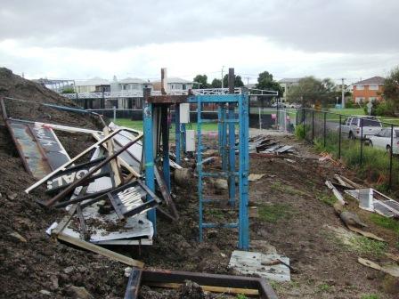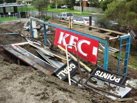 The 36 year old scoreboard at Williamstown, Victoria was demolished last Wednesday, 9 November. A servicable and solid structure (well, a tin shed shed on stilts), it will be replaced with a building that houses a curator’s shed, public toilets and an electronic digital scoreboard.