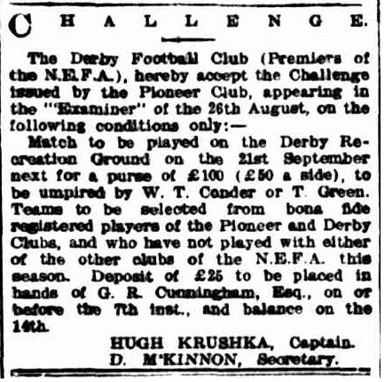 Derby has had a few sporting teams over the years. A 1912 newspaper article promoting an end of season challenge match between Derby and Pioneer suggests Derby Football Club won a flag 99 years ago in the NEFA (North East Football Association?).