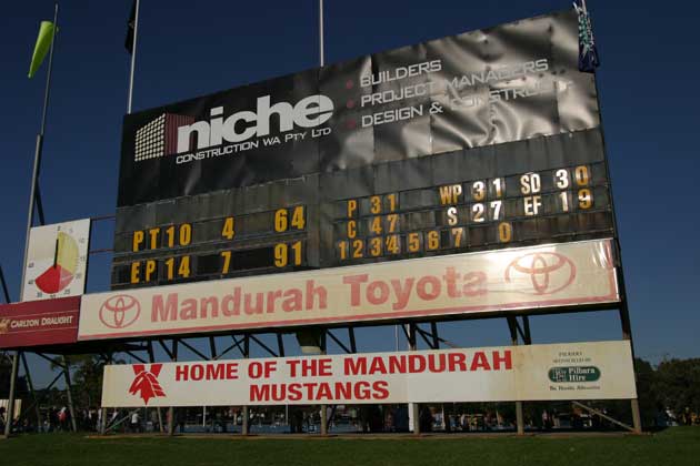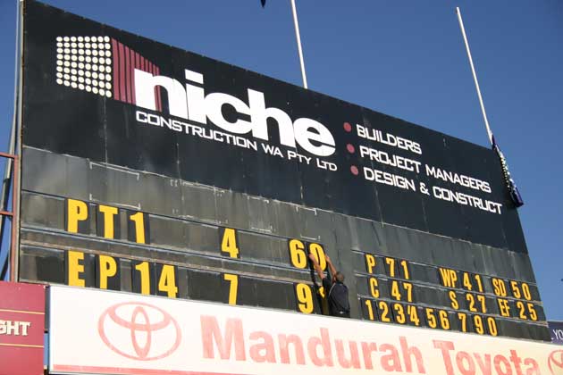Rod has been the scoreboard attendant at Rushton Park in Mandurah since Peel Thunder joined the WAFL in 1997. He did the job for the Mandurah Mustangs in the Peel Football League before that.