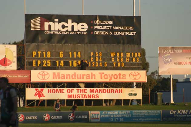 A radio hanging at the back of the board keeps Rod up to date with scores from other grounds and he prides himself on keeping all the scores as current as possible. “You’ve got to concentrate on this game though, that what you’re here for,” he said. And last Saturday there wasn’t much down time for the scoreboard attendant with East Perth scoring 25.14 (164) to Peel 18.6 (114) – that means a change of score about every two minutes.
