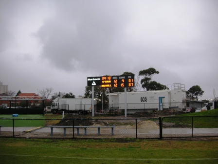 Williamstown unveiled its new scoreboard (and $8million ground and grandstand redevelopment) on a drizzly, grey day, in a losing game against Box Hill on Saturday 9 June. The scoreboard end was the scoring end and the Seagulls had turned their ten-point half-time deficit to an eight point lead half-way through the last quarter. But Box Hill, kicking to the scoreboard end in the last quarter, wrested victory by a goal, holding on in the slippery conditions.