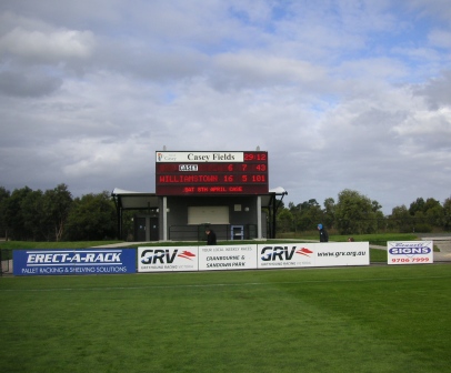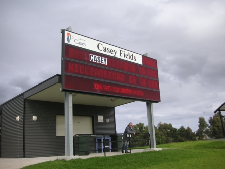 Casey Fields is in Cranbourne, 50 kilometres south-east of the MCG. There are a lot fields at Casey Fields and one of them is the home ground of the Casey Scorpions (Springvale Football Club in the old language). The Scorpions are aligned with the Melbourne Demons and are travelling well this year in the VFL. Top of the ladder, or thereabouts.