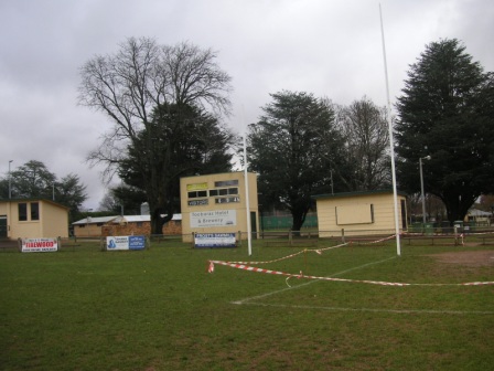 After our visit to Broadford, the Scoreboard Pressure father-son mid-week mid-July road-trip headed 20 kilometres south-west to Kilmore. It being mid-week there wasn’t any action at J. J Clancy Reserve. The electronic scoreboard was locked securely away under a roller-door. The old manual scoreboard on the fence had had its hooks removed, so we couldn’t even see if our old Williamstown numbers would fit.