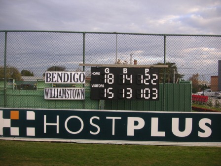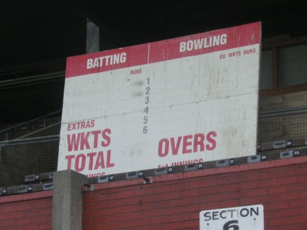 There are two scoreboards at Windy Hill these days: this generic scoreboard on the bowling club wing (formerly the site of the Wally Crichton Shelter) and, below, the substantial cricket scoreboard, in the Cookson Stand. Cricket has been played at Windy Hill since 1872. Past players include Test players Bill Woodfull, Gary Cosier, and Richie Robinson.