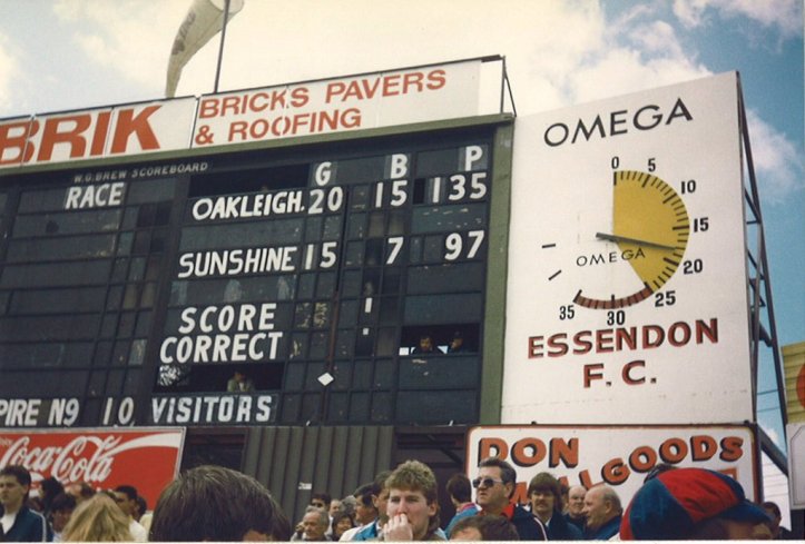 VFA Division Two Grand Final, 1988. Oakleigh kicked another two goals, Sunshine another two points. Within a few years both club had folded, as the VFA shrunk to a single division. Scoreboard Pressure would love to know more about those blokes inside the scoreboard.