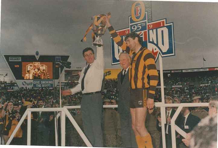 Coach Alan Joyce considers rejoicing and captain Michael Tuck almost smiles as they hold aloft the 1991 premiership cup. Waverley Park, or VFL Park, hosted just the one AFL Grand Final, when Hawthorn beat West Coast by 53 points: 20.19 (139) to 13.8 (86). Hawthorn ruckman Paul Dear won the Norm Smith Medal. The MCG was unavailable due to rather major works on the Southern, now Great Southern Stand. The Grand Final gained notoriety also for the so-called entertainment, which included Angry Anderson singing Bound for Glory from, or beside, a Batmobile.