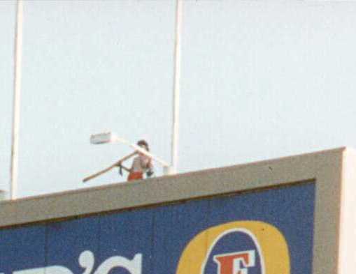But take a closer look at the top of the scoreboard, at the figure standing above the Foster’s apostrophe.