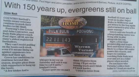The quest in the story is right up our alley too. Jonno Nash of the Sun is looking for the Victoria Country Football League’s oldest footballer after finding that three 50-year-olds – Paul Alger (Buln Buln), Joe Green (Poowong) and John Lancaster (Powong) played in the game shown on the scoreboard. If you know of a registered player who is older drop Jonno an email at jonno.nash@news.com.au and let us know by commenting on this post.