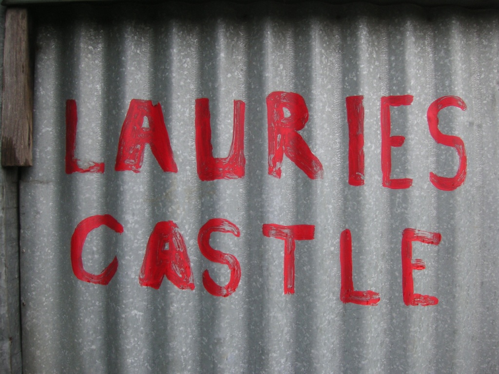 But all is calm ten years later on a Wednesday afternoon. I’m looking at red paint on a locked corrugated door at the top of steel steps, red paint that says LAURIES CASTLE.