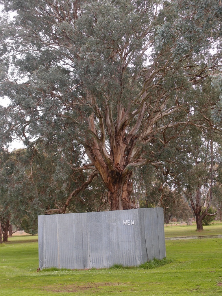 At one point I mosey off for a wander. There’s a pretty golf course backing onto the footy oval, with groups of locals walking briskly between holes, dragging their buggies. There’s a corrugated iron shed with MEN on the side beneath a spectacularly beautiful and generously spread gum tree and an ancient toilet block…