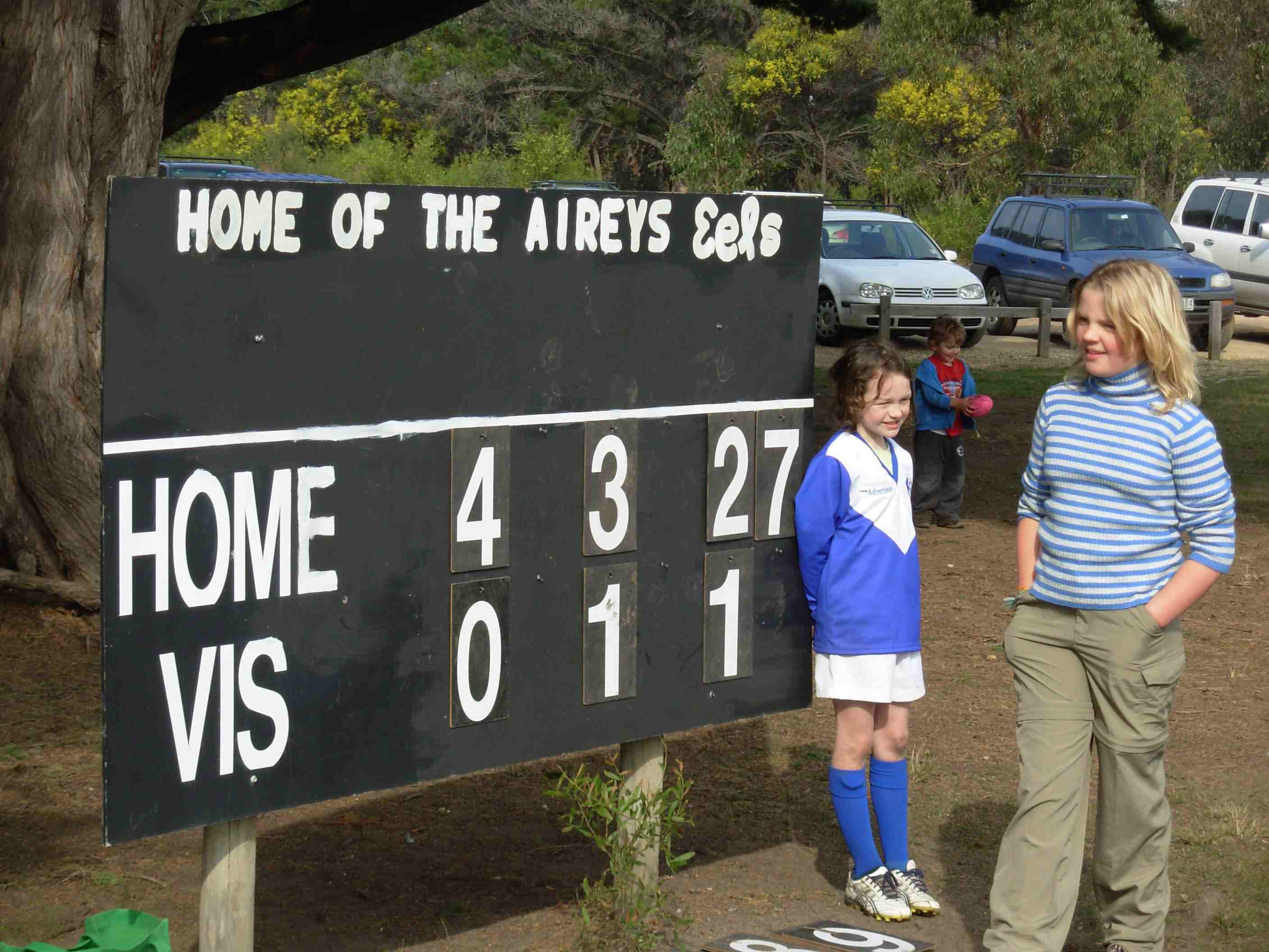 In this screen-shot a youngster is knicking the ‘5’ that indicated the Eels had kicked five goals. (Imagine if the score had been, say, 5.5 (35) )