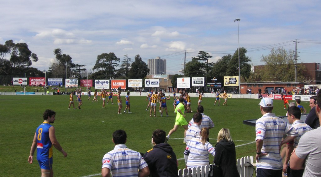 No siren sounded to formally mark the end of the fourth quarter but the ground announcer announced the start of ‘golden goal’ time. For seven frantic minutes the scores remained tied until an off-target kick into the Williamstown forward line was pushed through for the winning behind. The siren sounded immediately.