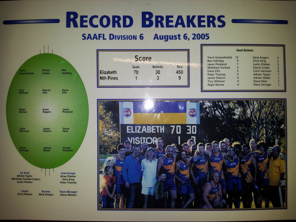 We had a win that day, but it was nothing like the one the club celebrated in 2005 when the A Grade booted an amateur league record of 70.30 (450) against North Pines, beating the previous titleholder by 58 points.