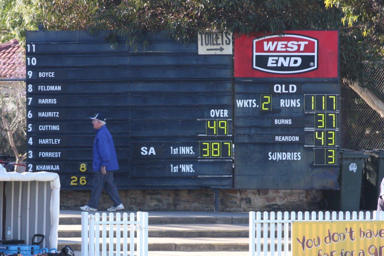 A piece of South Australian cricket history – not the majestic Adelaide Oval scoreboard – but still providing plenty of information to the small crowds at the inaugural first class fixture at the Bay – Glenelg Oval, South Australia versus Queensland, from October 29 to November 2. The scoreboard may not be world class but the setting is!