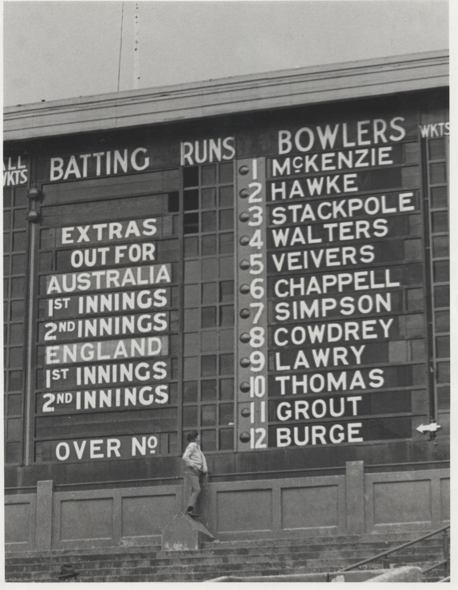 A young cricket fan, almost dwarfed by the MCG scoreboard, looks up and down at the names of the Australian team, reads ‘Cowdrey’ and perhaps ponders, ‘Doesn’t he play for England?’ (Meanwhile, a bespectacled and be-hatted gentleman, far left, tries to catch the photographer’s eye.)