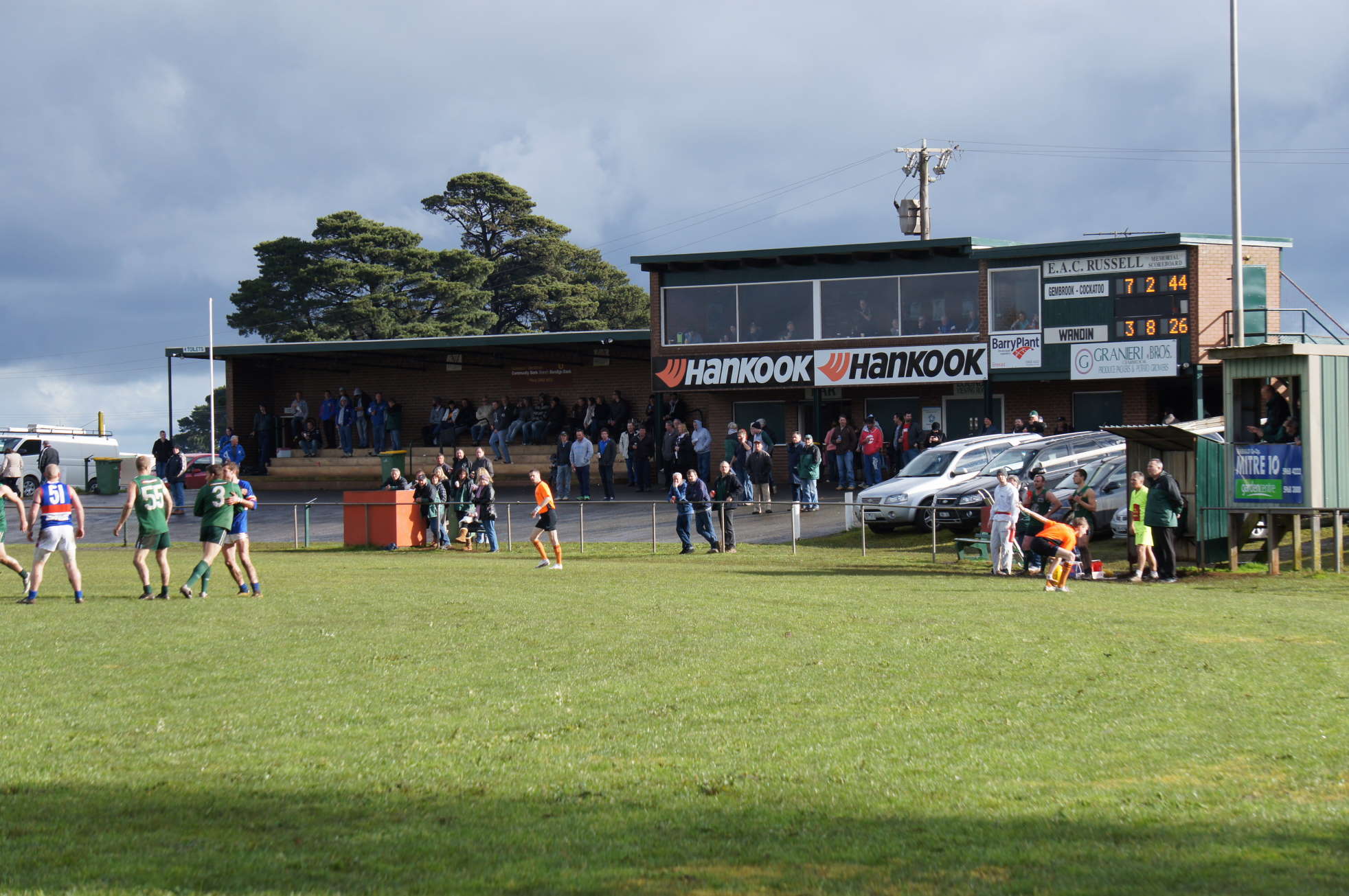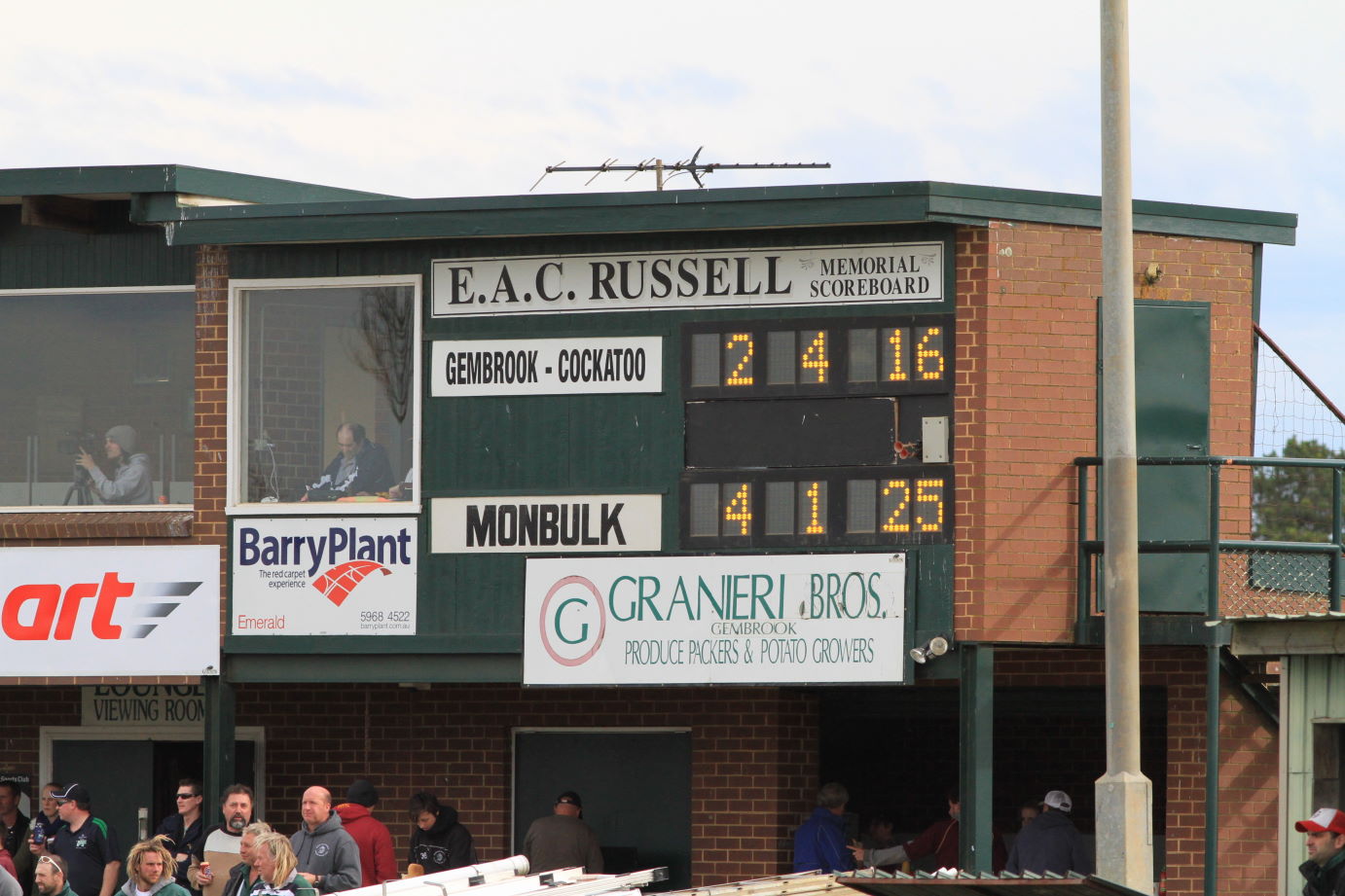At Gembrook, the E.A.C. Russell memorial scoreboard is an example of the growing number of electronic boards at local grounds. This scoreboard, named after a prominent local identity, was installed in 2008 to replace an interesting manual number-roll arrangement. The ground’s original scoreboard had been located on the outer wing in a space now occupied by an advertising hoarding. A regular YVMDFL finals venue, the Gembrook ground was opened in 1965 and is positioned in an exposed location on the crest of a hill. The Gembrook-Cockatoo Football Club had the misfortune of finishing as runners-up in the First Division of the Yarra Valley Mountain District FL in 2010-11-12. The end of that era was highlighted in 2013 when the club plunged to last on the ladder. It will play in Second Division this year, and has applied to join the Ellinbank and District FL from 2015.