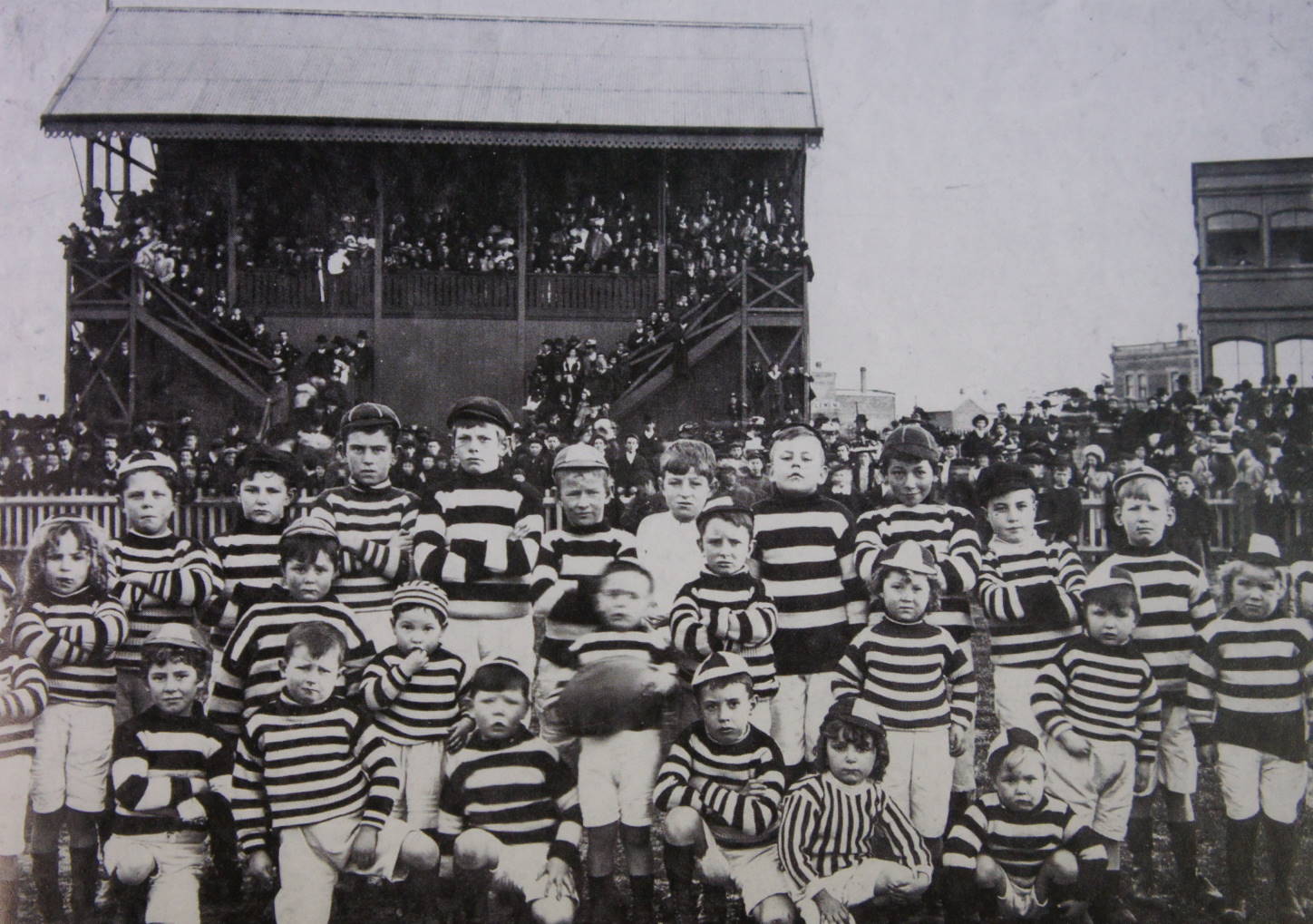 Here is a picture of children of Brunswick players posing in front of the old grandstand in 1908 (photo: Brunswick Library).