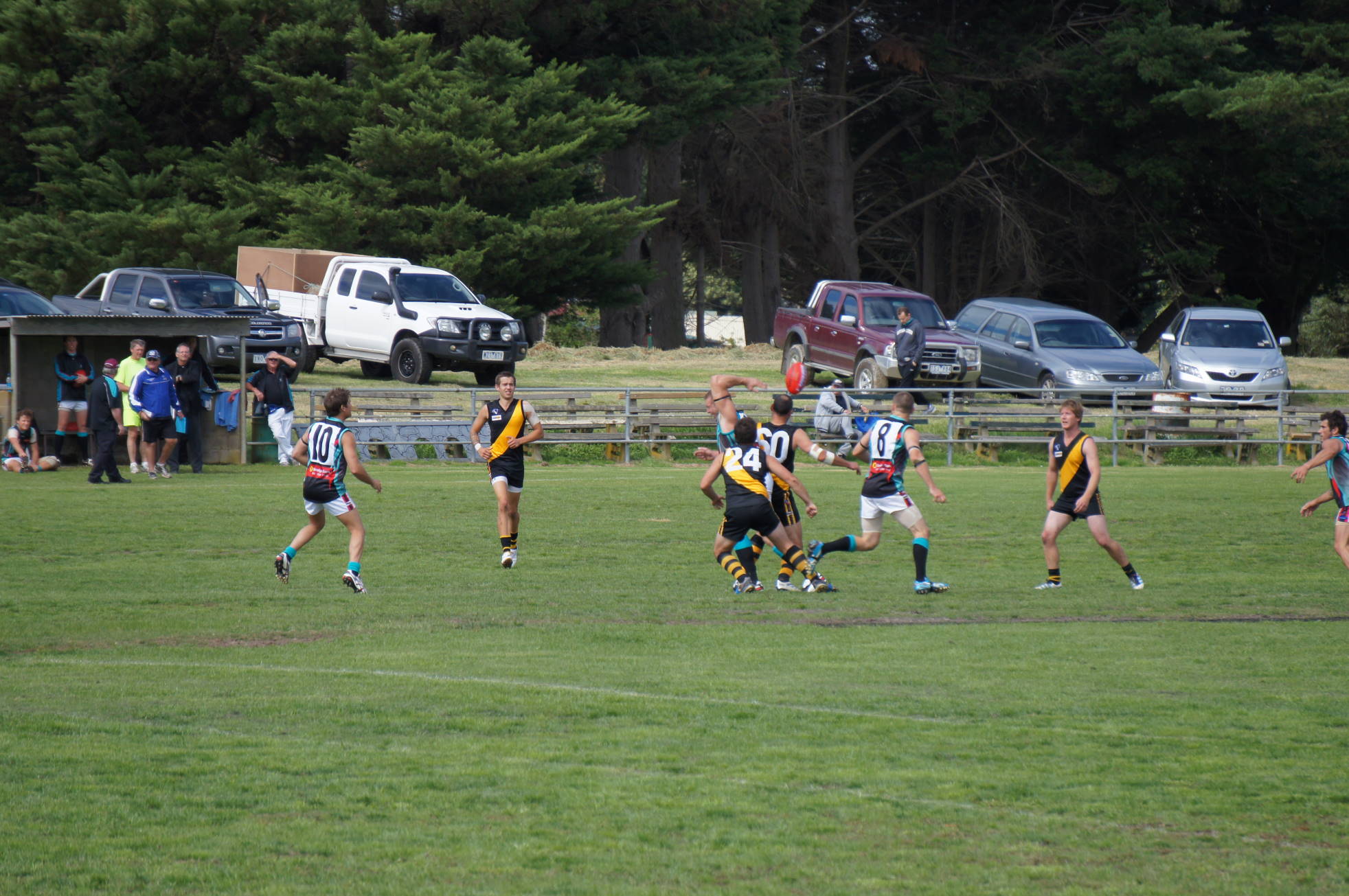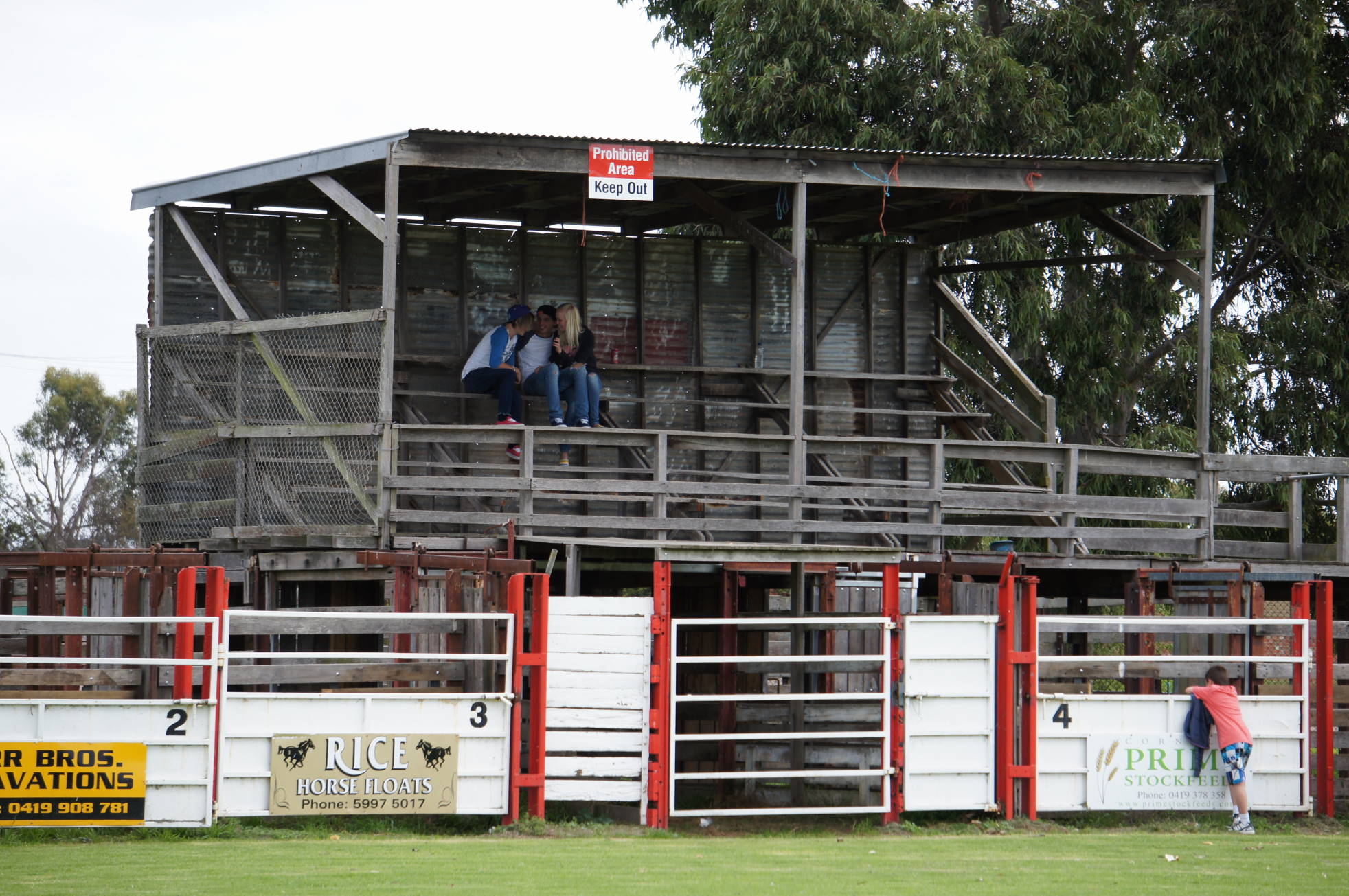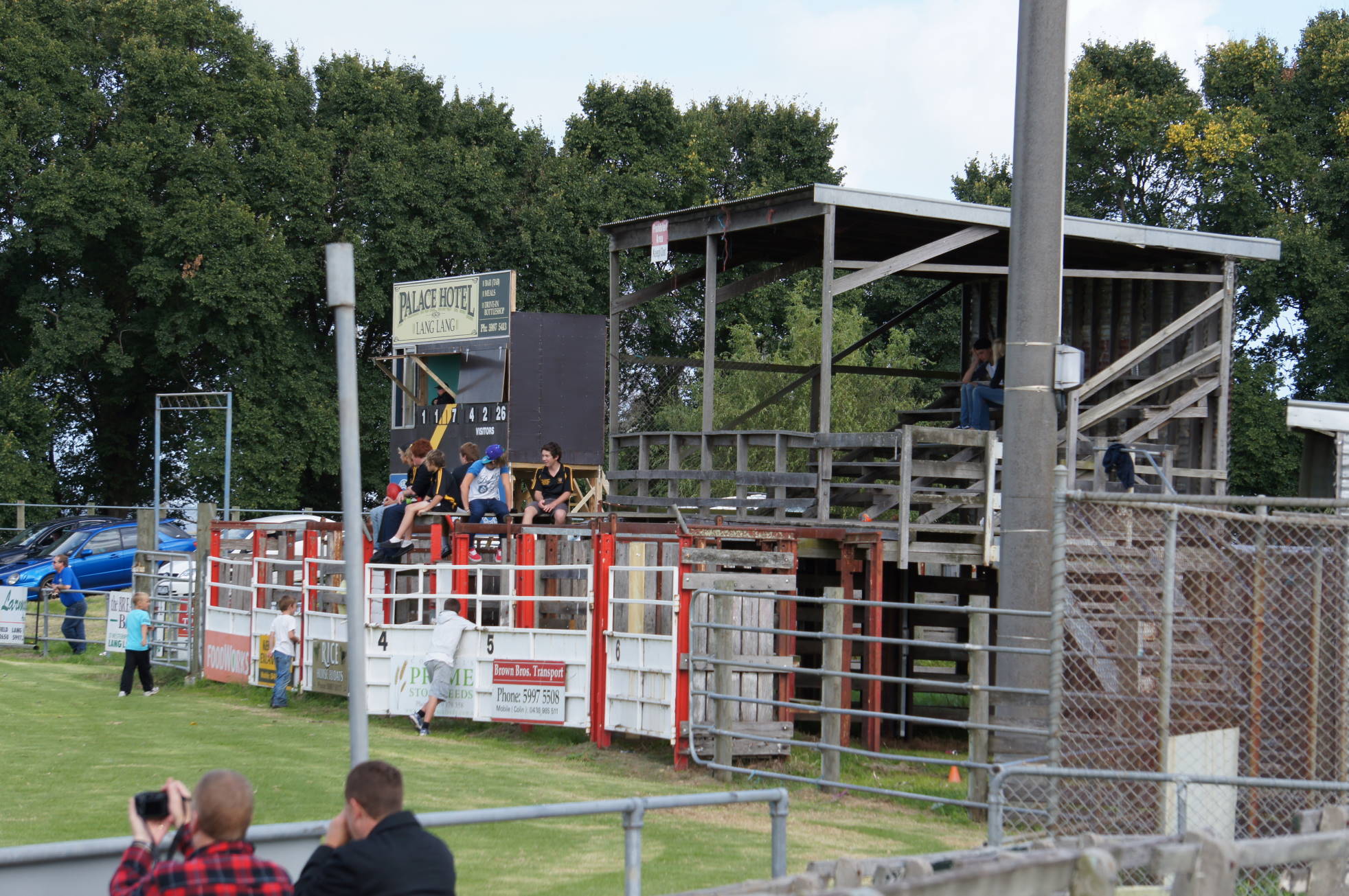 The Lang Lang Football Club first came to my attention in 2001 when an article in the Herald Sun reported that the Tigers were due to play in a grand final against Buln Buln and were hoping to break a 73 year premiership drought. On a whim, I headed down to Darnum that weekend to watch the match. Buln Buln won fairly easily (18.18 to 10.7), and Lang Lang’s 1928 flag remains the club’s last senior premiership. Or was it? The club also holds a 1936 Korumburra-Lang Lang Football League premiership. Lang lang 9-9 def Leongatha 9-6. The Tigers would be long odds to win the 2014 premiership, but the club has made a good start to the season by winning two of its first three games. The stock pens, the rickety wooden stand, and the scoreboard lend a certain charm to the Lang Lang Showgrounds. I like the three teenagers disregarding the ‘Keep Out’ sign. These pictures were taken at the start of the 2012 season. The home side lost to Cora Lynn that day, 5.12 to 10.12.