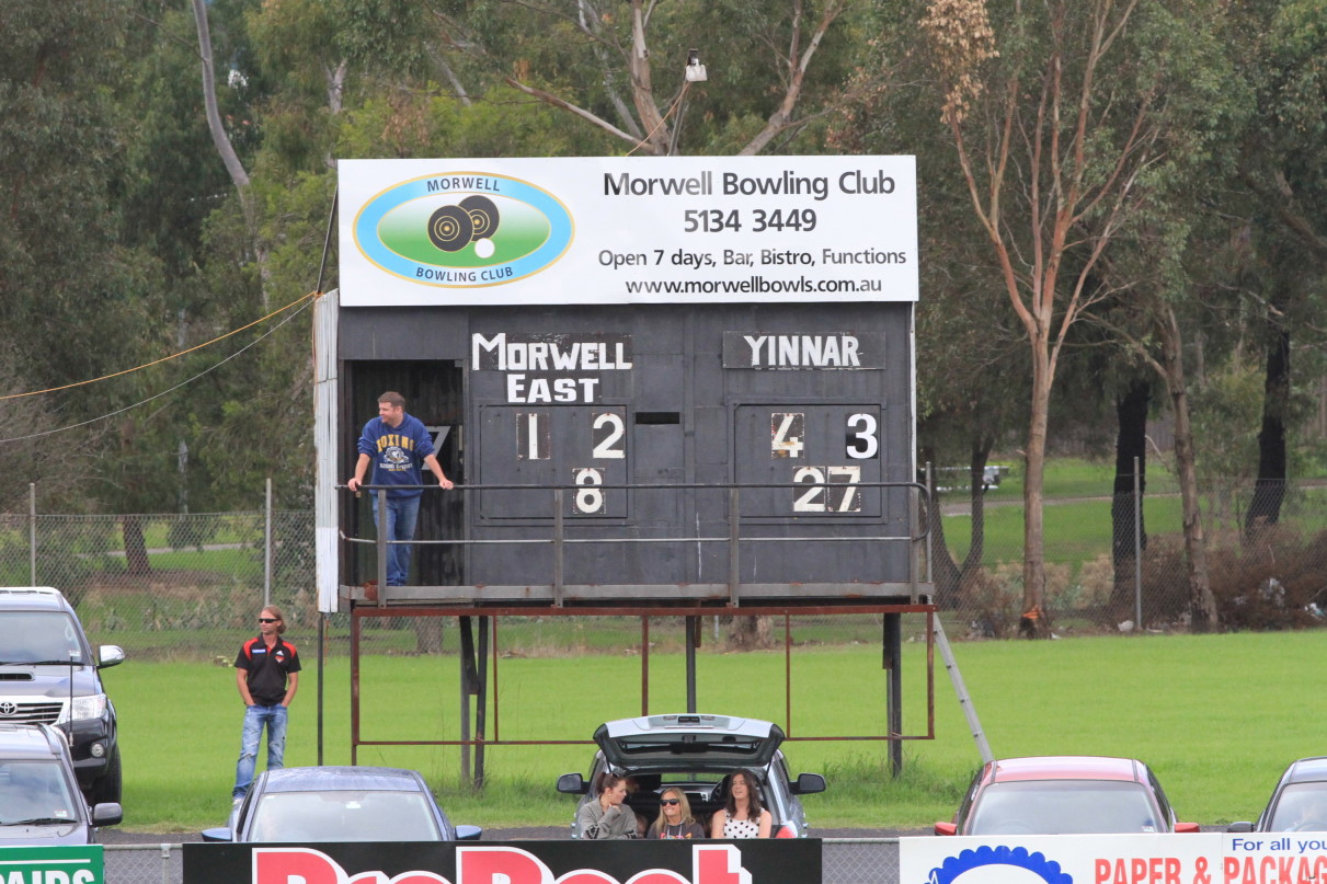Now, here is a fine looking scoreboard. It is at Ronald Reserve, the home ground of the Morwell East Football Club. The East put up a good show against the powerful Yinnar last Sunday before going down by 41 points, 7.8 to 13.13.