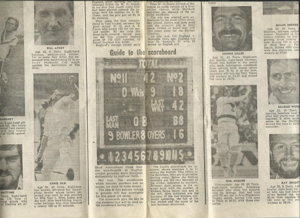 This article about how to read an English scoreboard was part of a four-page supplement previewing  1980 Lords Centenary Test. The main articles, by Age journalist Peter McFarline, previewed the match (‘Repeat of history a 100-1 chance’) and looked back to the very first Test between England and Australia (‘Upstart colonials taught a lesson’).