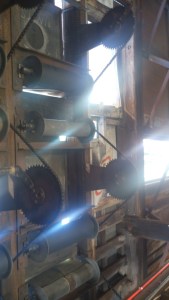 The scores are controlled by hand using a series of rollers controlled by cogs and bicycle chains.