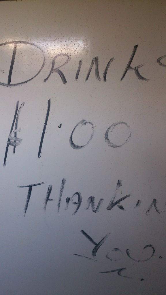 We didn’t open the fridge with the “DRINKS $1 EACH” sign, but since there is no air-conditioning in the box, I expect that it was kept full at all times.