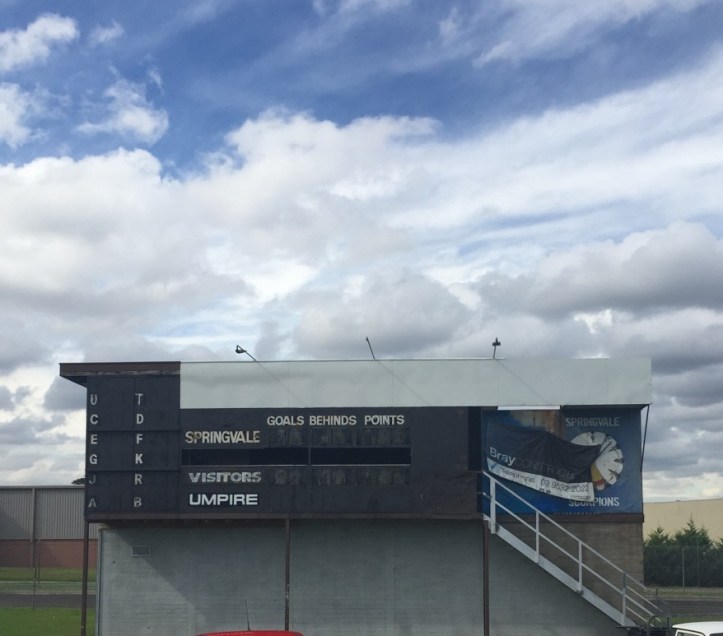 This scoreboard was used at the Newcomen Rd ground while Springvale played in the VFA/VFL right up to 2006. At a guess, the scoreboard was built for Springvale’s entry to the VFA in the early 1980s. Springvale won four flags in five years in the 1990s. They now play as Casy Scorpions at Casey Fields.