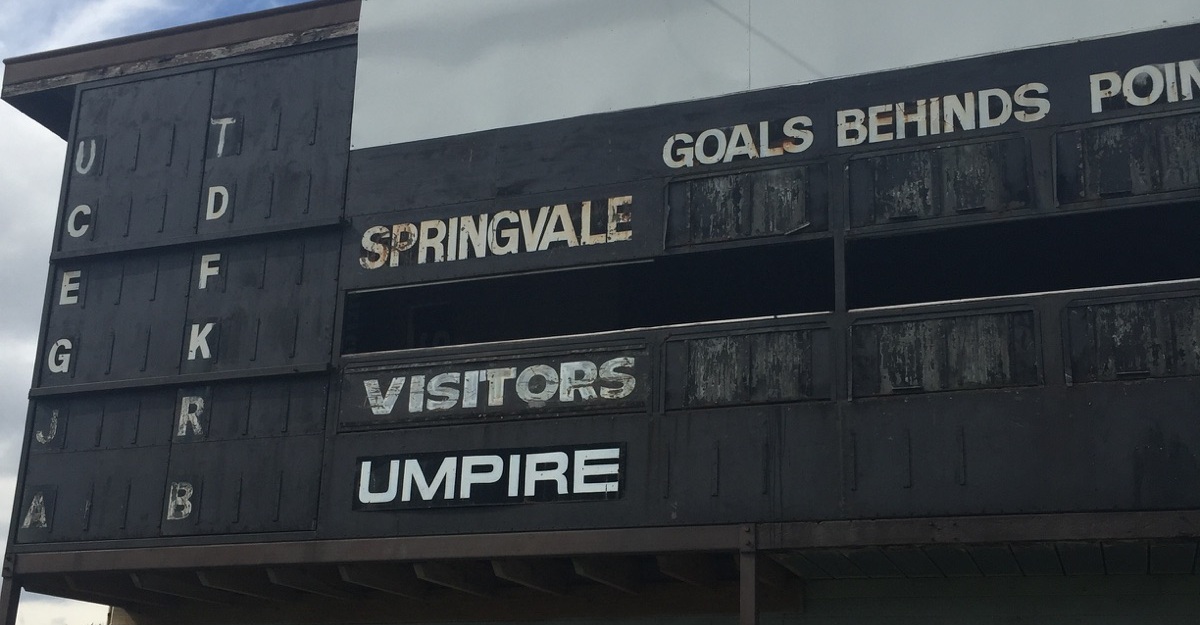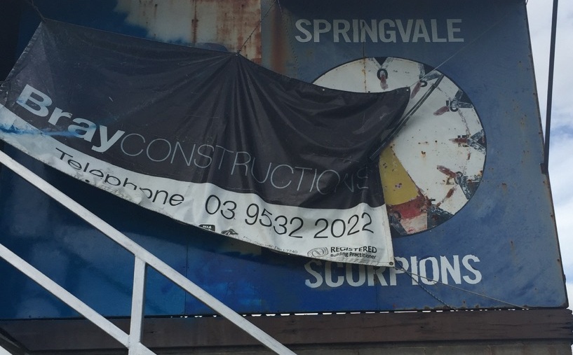 This scoreboard was used at the Newcomen Rd ground while Springvale played in the VFA/VFL right up to 2006. At a guess, the scoreboard was built for Springvale’s entry to the VFA in the early 1980s. Springvale won four flags in five years in the 1990s. They now play as Casy Scorpions at Casey Fields.