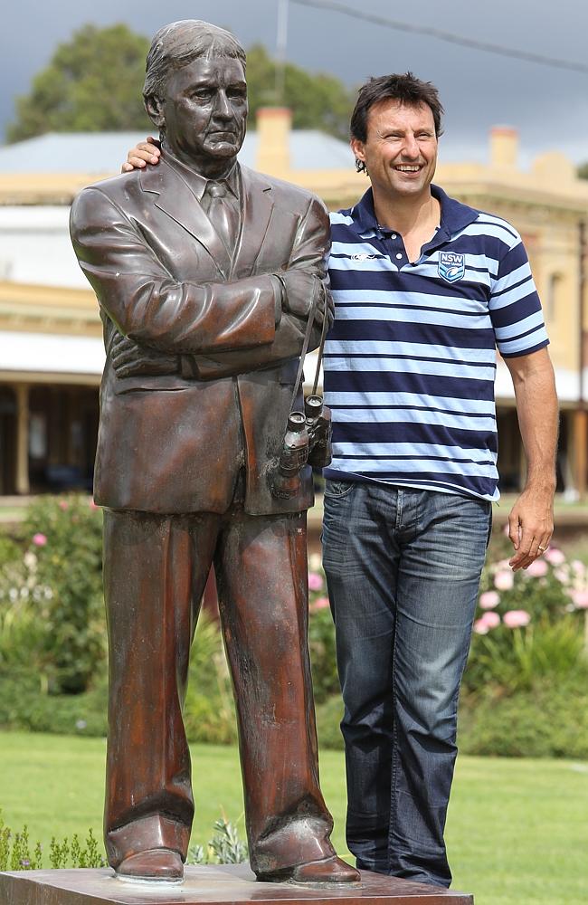 Two Junee boys, hamming it up in the centre of town. Legendary commentator Ray Warren (left) and legendary Laurie Daley.