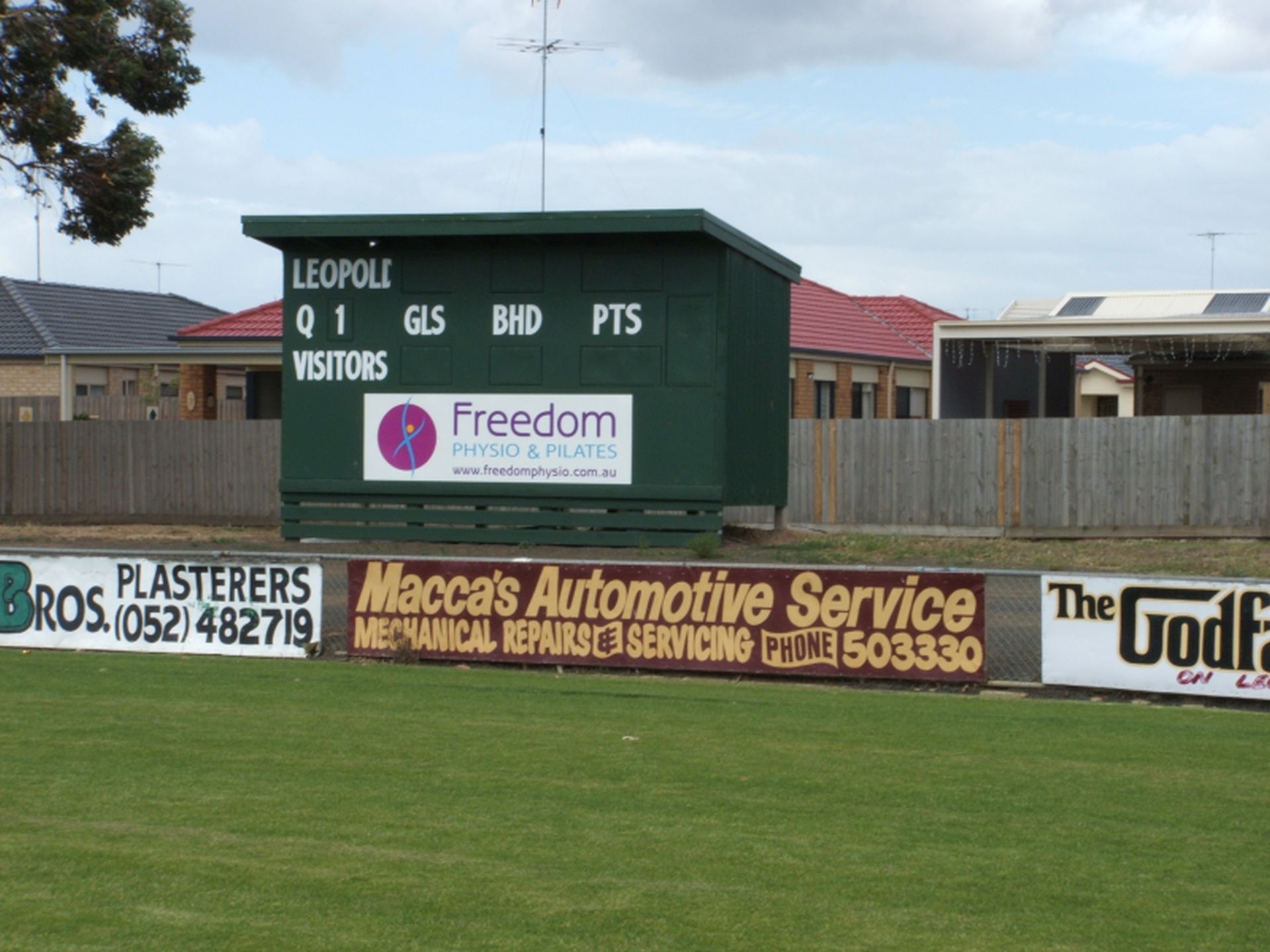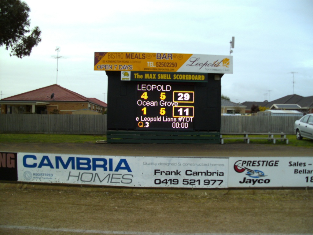 The scoreboard was named in honour of the late Max Snell. Max played 150 games for Leopold and was a Committee member and Reserves and Seniors Timekeeper for 15 years.