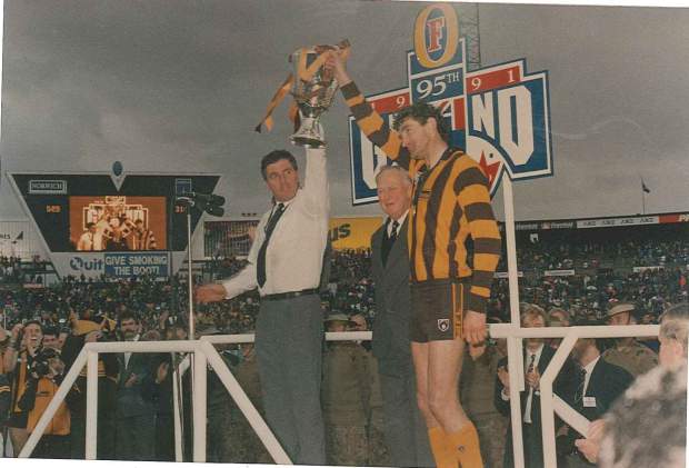 Hawthorn coach Alan Joyce considers rejoicing and captain Michael Tuck almost smiles as they hold aloft the 1991 premiership cup.