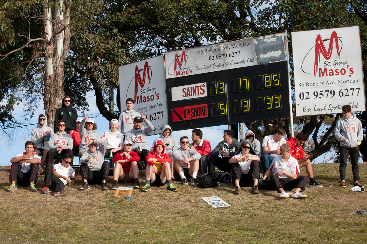 At this late stage of the season the St George Dragons were gathering momentum in the lead up to the finals, and the Under 19s and Division 1 teammates perched under Maso’s Scoreboard were giving plenty of witty support to the seniors, who went on to win by nearly 100 points.
