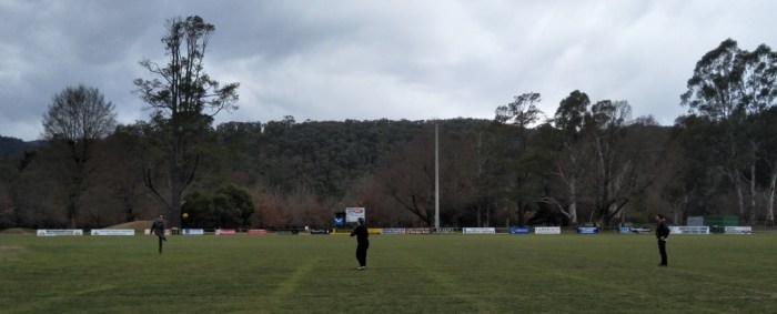 The scoreboard at Bright, in north-eastern Victoria, was locked on Father’s Day. My disappointment was tempered by my respect for, and appreciation of, this old-school scoreboard. Look at that chicken wire. Look at those neatly painted numbers. Look at the smaller numbers above the larger numbers. Bright has a scoreboard attendant, whoever he or she is, who takes care, who pays attention to detail, who likes everything neat and tidy.