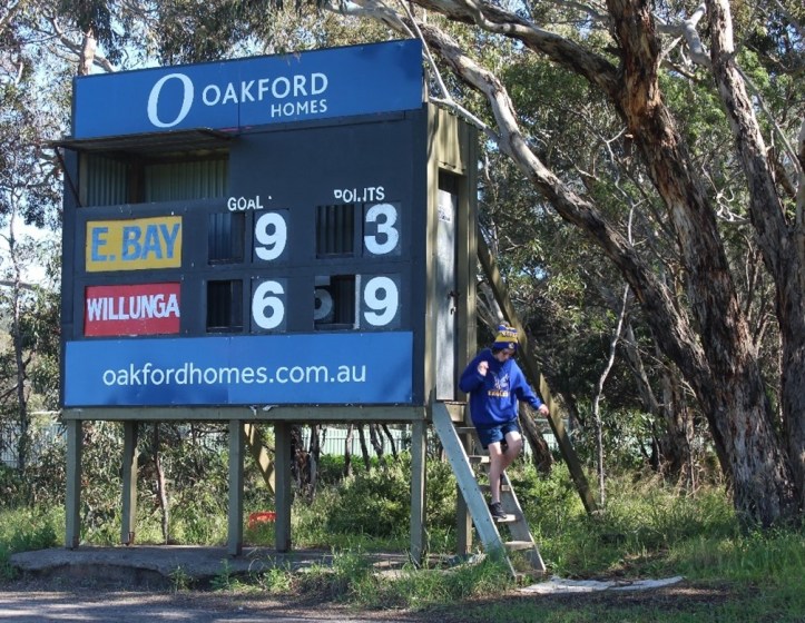 In 1988 the old scoreboard was replaced with the current steel structure that allowed the scores to be adjusted from behind, erected west of its previous position and further back from the fence. Such boards have become an archetypical piece of Australian football architecture, often nestled, as the EBFC one is, in some remnant scrub. It was always the responsibility of a few of the younger lads to look after the scores, and over recent years it has become something of a rite of passage for junior footballers after their match to climb into the board, and stick their heads through an opening to keep the scores up to date and the crowd and goal-umpire Lew happy.