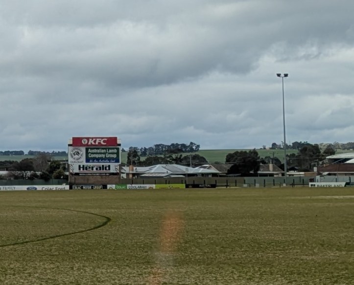 Ross Blair happened to be in the country town of Colac. (Famous for Cliff Young, Luke Hodge, Aaron Finch…) Ross happened to be at a footy ground. He spied two scoreboards in the distance, one a little hard to find, one now an advertising hoarding for non-vegetarians. Ross happened to have a camera. Well, a phone.