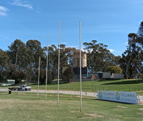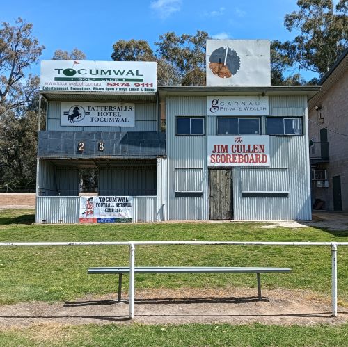 Like other grounds in the Riverina region, the old scoreboard is hanging in there, even though there is an electronic scoreboard. And like the old Cobram scoreboard, Tocumwal has a wire basket/net to catch numbers destined to catch the wind. Maybe it was Jim Cullen’s idea?